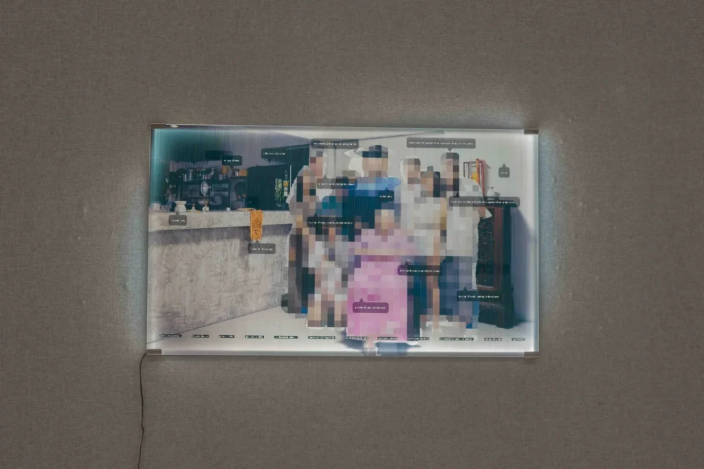 Family photos are no longer the private treasures they used to be, confined to the eyes of family members. They are uploaded to social media, automatically recognized and tagged, capturing details like appearances, locations, time, and even weather as data. The artist has forgotten the relatives in group photos and the once familiar places. When a series of similar landscape family photos is handed over to mechanical analysis, it yields a string of keywords, which are then reinterpreted to reveal the essence of these unfamiliar group captures.