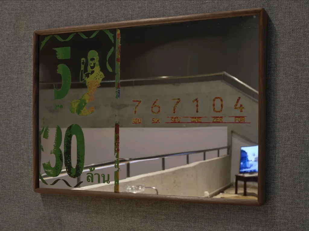 Mirror, mirror, what is my colour and number of the day (2023) 採用鏡面反射,讓觀眾在藝術品前站立時能看到自己、周圍環境和彩色打印。翻轉、收窄和擴大瞳孔的動作將注意力集中在不同的匯聚點上。觀眾所感知的具體內容仍然模糊不清;鏡子上的印象只是我印象的抽象表現,轉化為藝術品,進一步投射到站在其前的觀察者身上。這種方法旨在立即將觀眾浸入展覽中,從視覺入手,逐漸引入更多的感官因素,隨著他們過渡到後續的藝術品。在作品 Scarf in absence (2023) 中,隨著觀眾的移動,改變的光線折射導致不同的影像感知。另一方面,作品 House of holy (2023) 使用散射的LED燈創造閃爍的文字,需要觀眾暫停以觀察。這些視覺元素的結合旨在喚起觀眾一種奇異感,或許更恰當地描述為一種「外星」狀態。在香港的展覽空間中,這種情感不是指向西方特質,而是作為一種被排斥感的形式。在日常元素的熟悉中,存在著對不熟悉元素的遭遇(在這個情境下,是東南亞元素),呈現了一種脫離例行的體驗。對我個人而言,在多元文化背景中長大,我常常發現自己被這種氛圍所環繞,不論是在香港還是泰國,我都經常感受到這種難以言喻的過渡感。