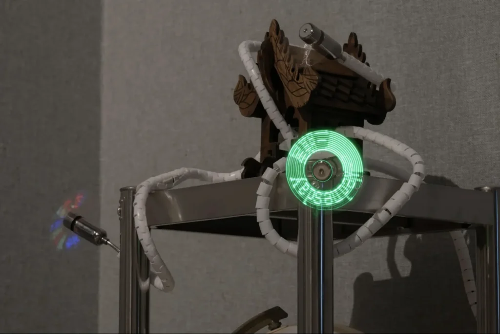 一座被他人遺棄的木質寺廟,其中的神祇或許已被轉移。藝術家在曼谷撿拾了它,然後將其置於香港的一個展覽中。周圍被小型風扇環繞,展示著五顏六色的文字,它像藤蔓一樣緊緊環繞著寺廟,受到了Phaya Naga的庇護,靜靜地等待著再次被人們所尊崇。
