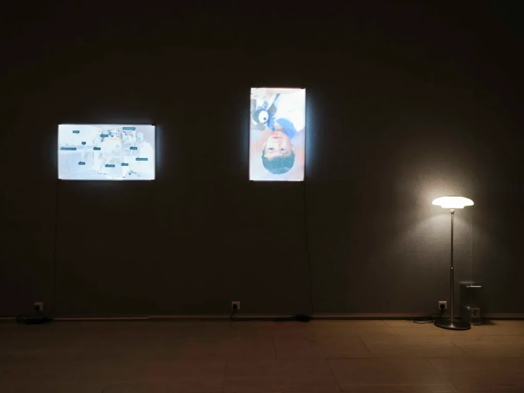 踏入展覽的起點,我將其定名為「虔誠角落」,其中包含了日常物品,如鏡子、絲巾、地球儀和電線,以回應我對信仰體系的多面理解。信仰並不僅僅局限於宗教背景,還延伸至現代信仰體系,如彩票、數字和數字數據。這種配置充當了我日常經歷的發泄通道,通過並置、組合、重疊和分解來融合多樣的元素。這種努力有意地朝著視覺混亂的方向發展,模糊其中的相互關係。整個展覽的照明並未精心安排;受限於固定的照明設置,藝術品置於視野中,與場地的灰階氛圍相協調。超連接的外觀通過觀眾從一件藝術品移動到另一件藝術品而實現。