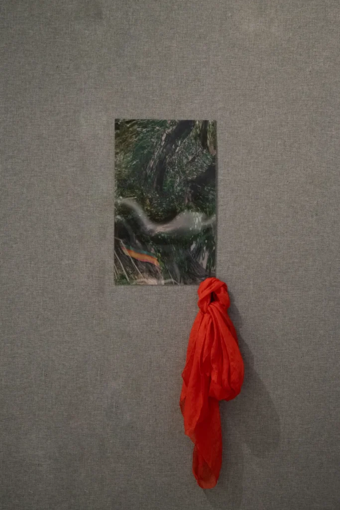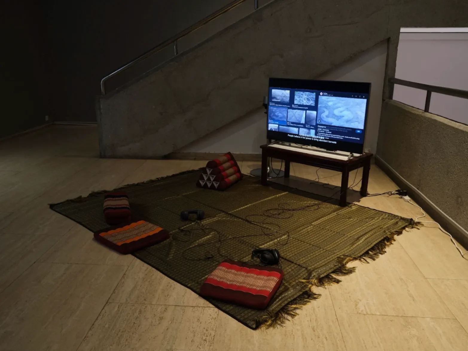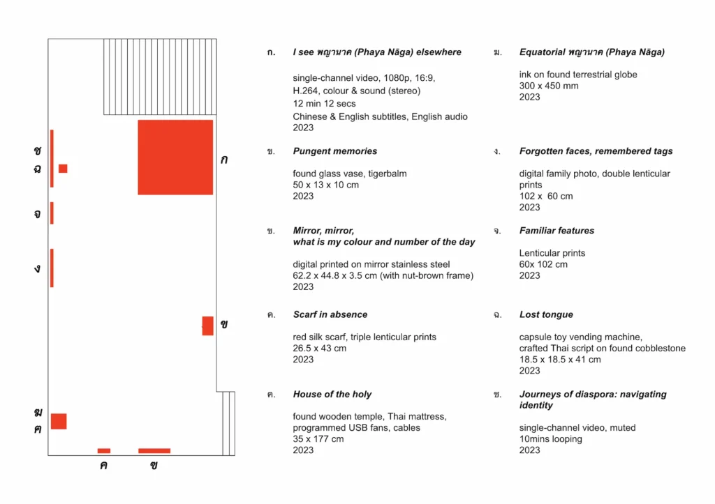 我拆解並揭示了構成我自己身份的各個層面。整個作品都是在僅有4平方米的有限空間中創作的,在由一個空間轉移到另一個空間時不斷演變。為了確保觀賞的過程不僅僅是單一的視角,某些作品被放置在不同的高度。例如,Lost tongue(2023)位於地面上,需要參與者進行身體行動,蹲下來進行觀察。這件作品還是唯一的互動藝術品,觀眾被允許將其中的一部分帶到展覽空間之外。相反,Pungent memories (2023)放置在大約腰部的高度,考慮到它的氣味特性,促使觀察者彎腰探索。唯一一個邀請觀眾坐下來的作品,I see พญานาค (Phaya Nāga) elsewhere(2023),提供了一個坐墊,邀請人們在一個定義的區域坐下。除了視覺元素外,身體的互動參與同樣至關重要;我們的感官和神經分佈在我們的整個身體。通過促進進一步的身體運動,我相信可以建立與展覽更深層次的聯繫。