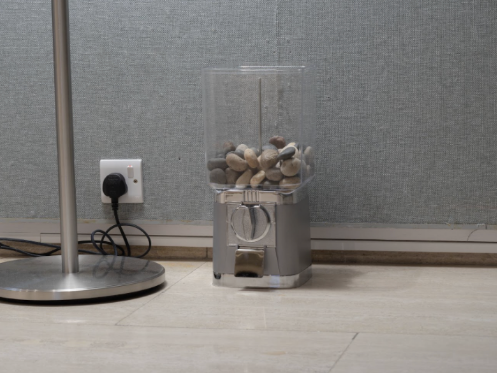 Capsule toy vending machine, crafted Thai script on found cobblestone