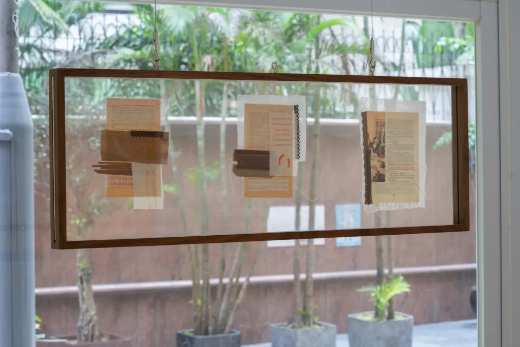 8件作品分品安置於空間內,在未進入展館前已經可以看見Kate的作品 I Heard (2022) 懸掛著, Kate把書頁撕下,以棉線穿起錄音帶、絲和布料裝飾,遺留特定字句能清楚閱讀,中空木框夾著3份組合而成的作品,進入展館後才能看見作品正面。所看見的字句,也是曾聽過的話語,是指向性的話語,逗留在心裡迴響著不可迴避。