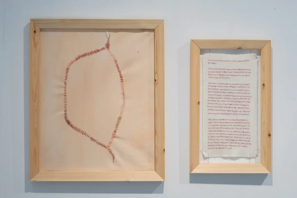 Kate 最後的一件作品被 it 的作品隔開了,是她是次展覽的最新作品 Twine (and its statement) (2023)。對比起她的其他作品,這件可能較為具像的,也在旁安放了由線聯成的作品具體陳述。一比一母親背部的疤痕形狀,以棉線轉移到兩塊布上,以棉線固定了一片布塊於畫面中央,恰好的平坦跟周遭的皺褶形成強烈對比,暴力與溫柔共存,互相依靠,棉線左右兩端顯示著兩種截然不同的肌理。