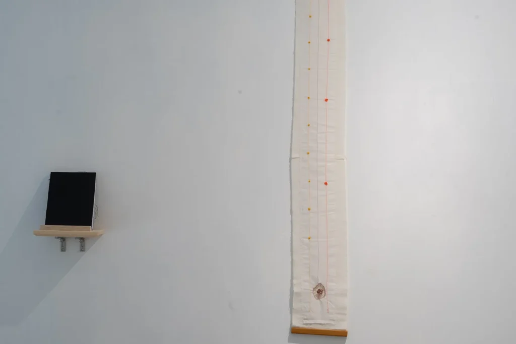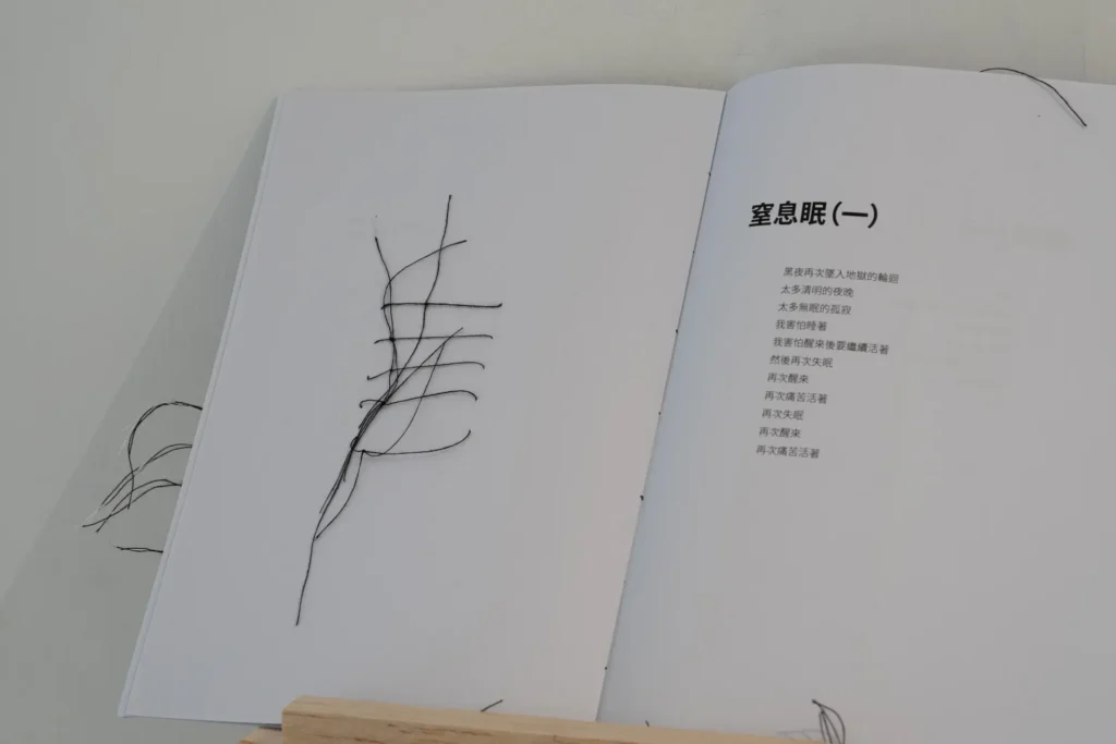 AGGREGATES (2021) 這是現存的最後一本 Artist proved 安置於牆身架上,可給觀眾翻閱的手造詩集。 是次展覽題的起源也源於它,不難在每頁置頂看見 (一)。對於不會中文的觀眾,中文字就是線的複合體,似是棉線以不同疏密交織一起。線和話語在Kate的作品上極為顯著,Before it happens all at once (2022) 就在詩集旁垂掛著,下垂的布條與似直非直的線給人一種安頓的感覺,視線不由自主跟隨線的向性上下移動,再像時間線一樣平行並置,在每一間距就有「線團」,衍生出一種節奏感,也像是「女書」的神秘文字,看似有跡可尋,但也是似懂非懂。