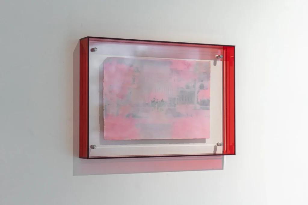 Reverse inkjet printed on soaked paper with crimson acrylic frame