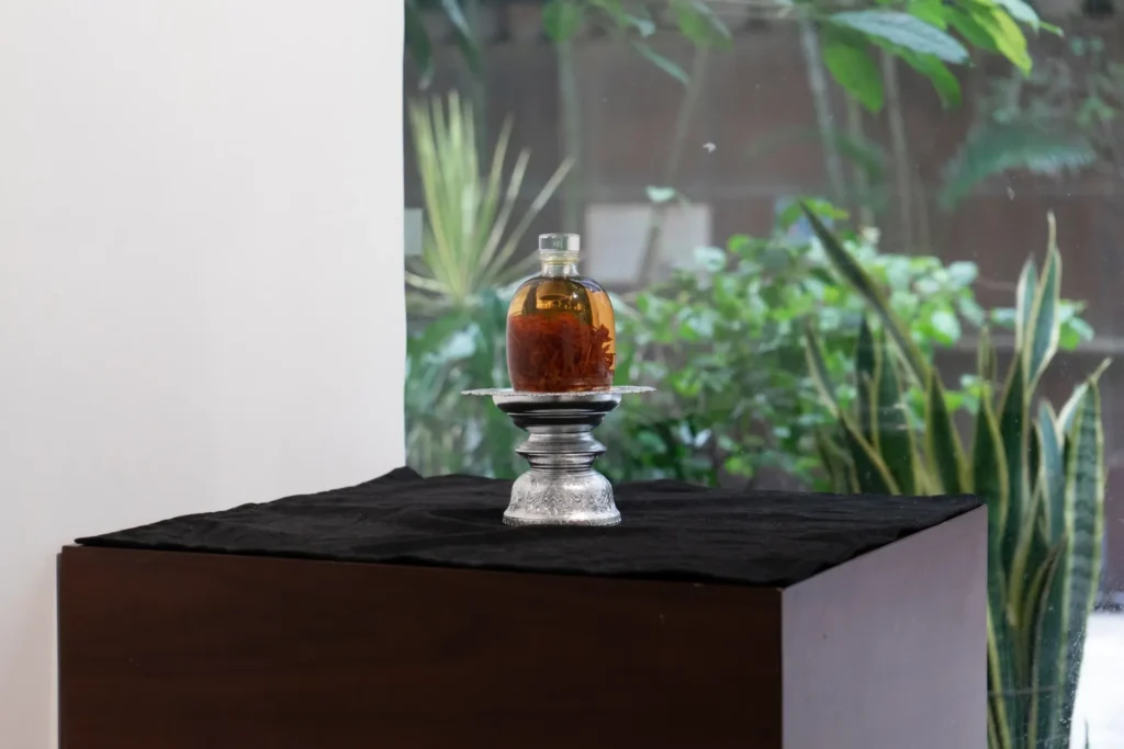 抽取了影片中的回憶,藝術家重新在香港以行動實踐,並在展場一個角擺放恭奉作品。The flower is red, is sweet and is dead: ขอโทษ (apologies) (2022) 是 it 在香港重新進行兒時的一件作品,以亡父最愛喝的酒浸泡著沒有花芯的仙丹花,使花青素的紅色融於酒精變的像褪色的回憶。旁邊掛著另一作品於牆上 Ubiquitous, never say goodbye (2023) ,也是藝術家特別為是次展覽的創作新作品之一。後製數碼照片把巨形仙丹花叢拼貼於泰國實景照片,水洗噴墨打印照片呈紅紅粉粉、平平無奇,近觀能看見淡化的「never say goodbye」,彷彿告訴著我們與環境的連繫是並不易遺忘的。