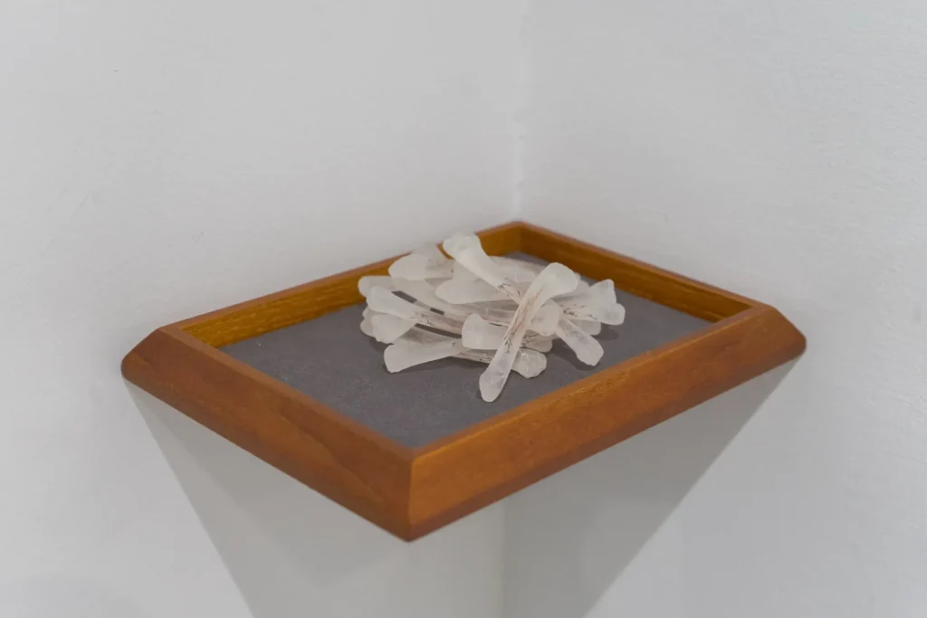 最後的一件作品 การแตกตา (budding)(2023) 擺放在 Kate 作品之間,與上一作品成對角,也是另一件新作品;這件作品也同時之間用來回應 Kate 常運用的棉線。仙丹花的花芯很脆弱,人們需要完整取出花芯才能淺嚐花蜜,為了不在過程中折斷,需要力度適當、角度適宜由末端拉出,花蜜才能在頂端形成一個水珠。隱蔽的花芯被取出,沒有了花蜜的165條花芯,鑲進15個半透明樹脂骨頭;牠們脫離了母體,移植、寄生,成為了另一物質的核。