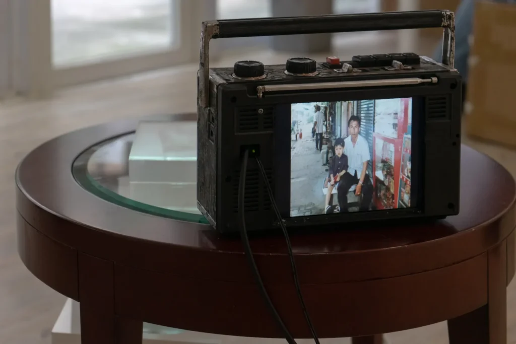 it 的4件作品運用著不同媒介演繹是次主題。剛進展場便能聽見的私私細語就是展場中心安放著圓玻璃面的木茶几 Trigger the Lost Past Pass (2020-2022) 所循環播放著。回應著 Kate 的 I Heard 般,是 it 兒時在泰國成長的瑣碎回憶,他編輯了跟已逝父親的合照,使肖像自己說出過去的事情,並把影片陷入收音機之中成為今天已不常見的日常物件。