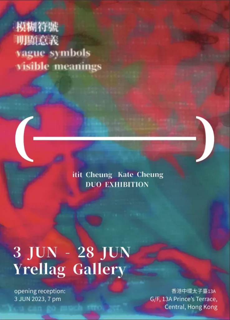 2023年6月3日 至 6月28日 Kate 和 it 的雙人展於中環在太子臺的 Yrellag Gallery 圓滿結束。以 (——) 為題, 跟著說明在後「模糊符號,明顯意義」(Vague Symbols, Visible Meanings), 暗示著符號只是一個引導性質,而符號代表著什麼, 就由兩位不同媒介的藝術家透展覽中的作品再邀請觀眾一同思考。兩位藝術家也是於香港城市大學創意媒體學院畢業; Kate是文學士, 而it是文理雙學士。兩人第一次於藝術的碰撞和交流,也一同圍繞著「關係、 連結、 連繫」作出了不同的詮釋。 <更多關於展覽>